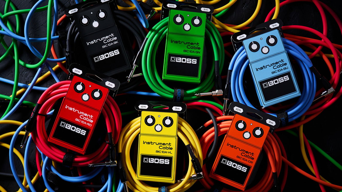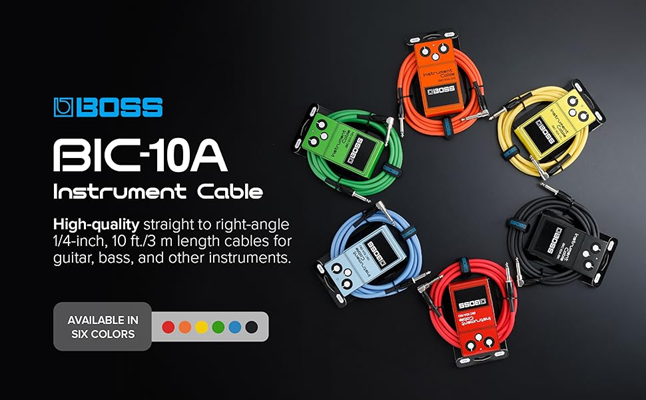 Conectores de 1/4 de pulgada de ángulo recto a recto, 3 m (10 pies) de longitud. Disponibles en negro (BOSS BIC-10A-BK), naranja (BOSS BIC-10A-OR), amarillo (BOSS BIC-10A-YL), verde (BOSS BIC-10A-GN), rojo (BOSS BIC-10A-RD) y azul (BOSS BIC-10A-BU).