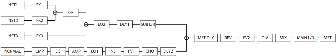 | Efectos polifónicos | Distorsión polifónica, cristal, marcha lenta | Efectos aplicados individualmente a cada cuerda (solo a través de la entrada GK). |