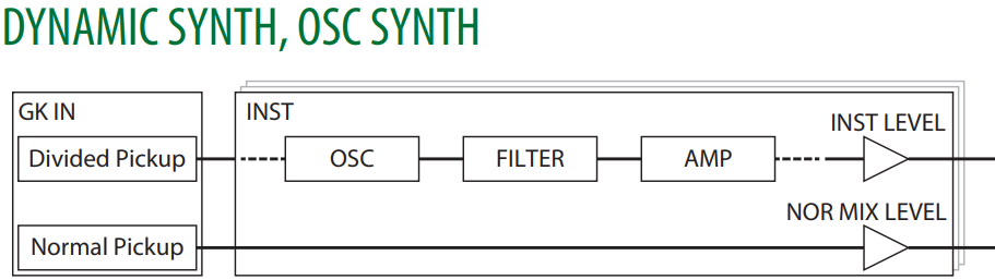 | Entrada normal | Sintetizador dinámico (limitado) | Permite el uso del motor de síntesis con un cable jack estándar de 1/4" (no requiere pastilla GK). |