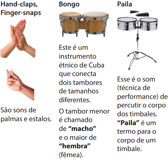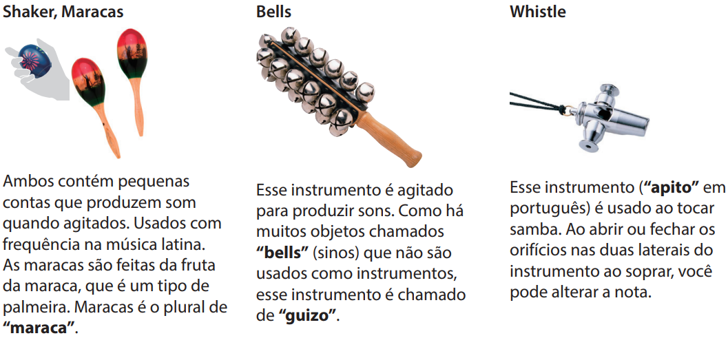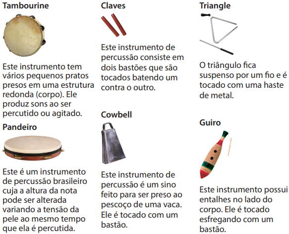 Instrumentos: Coctelera, Maracas, Campana, Silbato, Pandereta, Pandeiro, Claves, Cencerro, Triángulo, Bongo, Palmada, Paila, Conga, Cajón, Batería, Metrónomos, Efectos de sonido