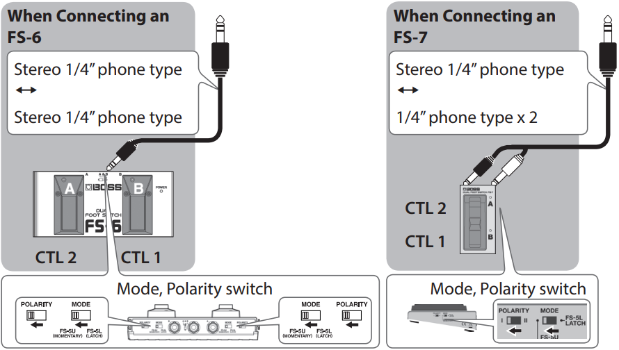 | CTL 1, 2 | 1/4 TRS (conector de 6,35 mm) | Control externo | Entrada para pedales (p. ej., BOSS FS-5U, FS-6 o FS-7). Permite controlar el inicio/parada, la variación de patrones o el tempo de marcación con el pie. |