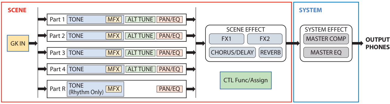 | Multiefectos (MFX) | Cada una de las 5 partes (4 tonos + 1 ritmo) | Procesador dedicado por partición. Más que 90 tipos Una gama de efectos para un modelado detallado. Incluye Overdrives, Distorsiones, Modulación (Chorus, Flanger, Phaser), Delay, Compresores y mucho más. |