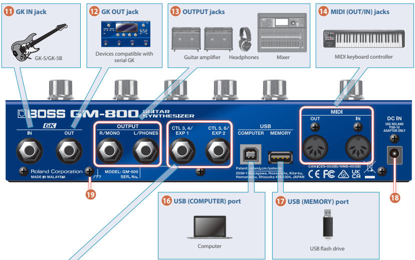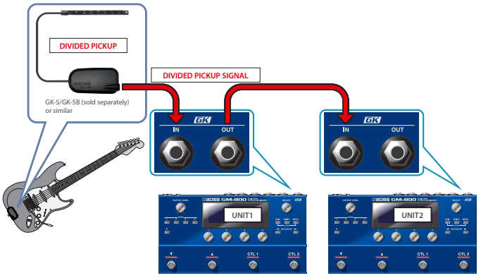 BOSS GM-800 Cuenta con la interfaz digital GK recientemente desarrollada, que admite la entrada de guitarra/bajo desde las nuevas pastillas divididas.BOSS GK-5 (Guitarra)o BOSS GK-5B (Bajo) y fácil conexión de múltiples unidades BOSS GM-800Los cuadros de conversión BOSS GKC-AD y JEFE GKC-DA También están disponibles para dispositivos GK clásicos de 13 pines, lo que le permite utilizar el BOSS GM-800 con una camioneta Roland GK-3 (Guitarra) o Roland GK-3B (Bajo) y utilizar dispositivos de la serie GK con el BOSS SY-1000.