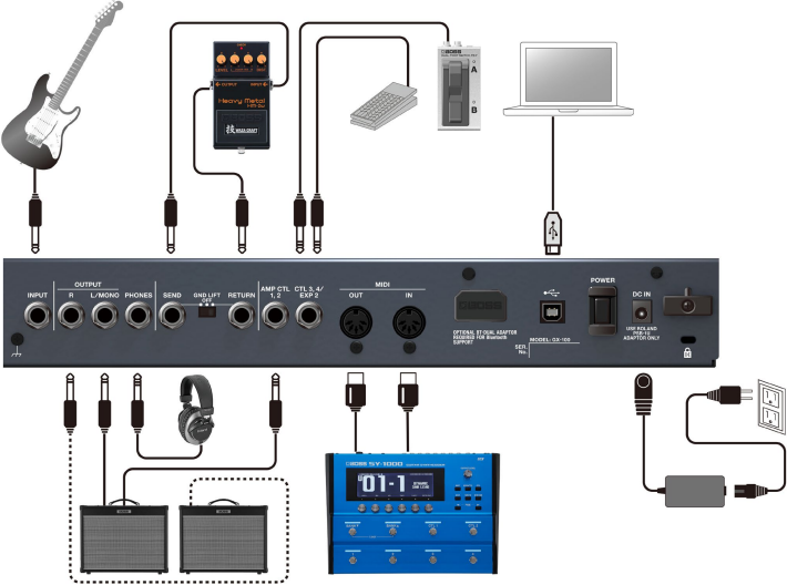 | Control del amplificador | Salida del interruptor CTL/AMP | El GX-100 tiene una salida dedicada paracambiar el canal (cambio de canal) En un amplificador externo (de válvulas), esta es una característica valiosa para quienes usan la pedalera junto con un amplificador tradicional. |