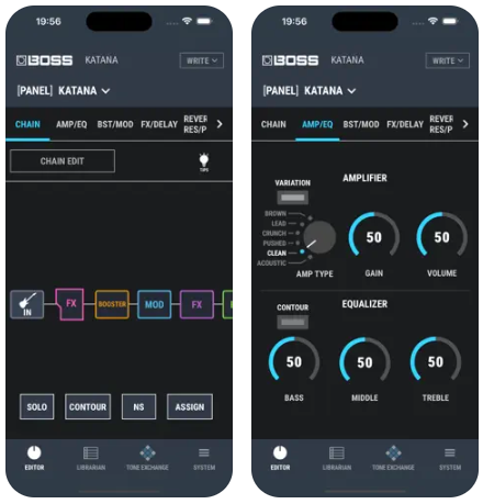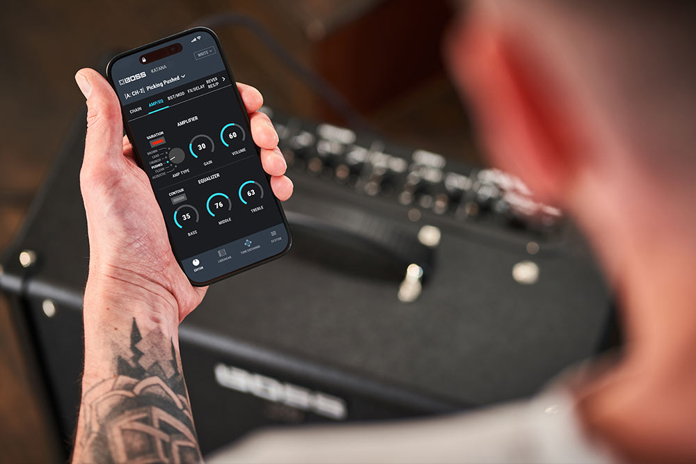 BOSS Tone Studio para Katana Gen 3: La aplicación se ha mejorado para una edición remota más intuitiva, lo que permite una personalización detallada de amplificadores y efectos (incluido el orden de los efectos, ecualizadores globales, etc.) a través de una PC, Mac o dispositivo móvil (con adaptador Bluetooth opcional).
