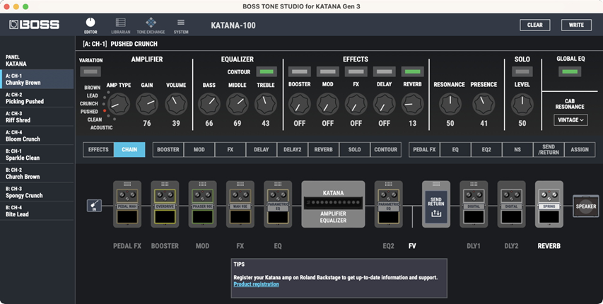 Software de edición BOSS TONE STUDIO (BTS) a KATANA JEFE GEN 3 Ofrece nuevas mejoras visuales y opciones de personalización gráfica que hacen que crear tu sonido sea más rápido e intuitivo. Explora las herramientas de edición de amplificadores y efectos, cambia el orden de los efectos y moldea el sonido general con el control CONTOUR de 3 vías y varios ecualizadores. Trabaja con la configuración y el comportamiento de todo el sistema y organiza configuraciones personalizadas para todas tus actuaciones. También tendrás acceso a la plataforma BOSS TONE EXCHANGE, donde puedes descargar configuraciones profesionales y compartir sonidos con la comunidad mundial de BOSS KATANA.
