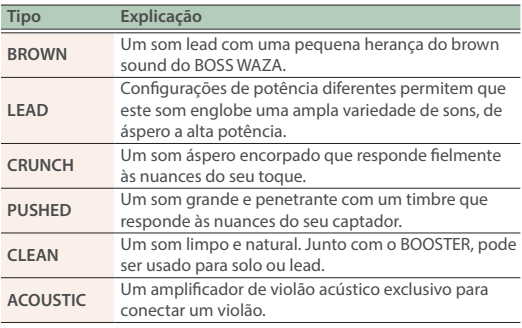 6 tipos de amplificadores: LIMPIO, CRUJIENTE, EMPUJADO, PLOMO, MARRÓN, ACÚSTICO