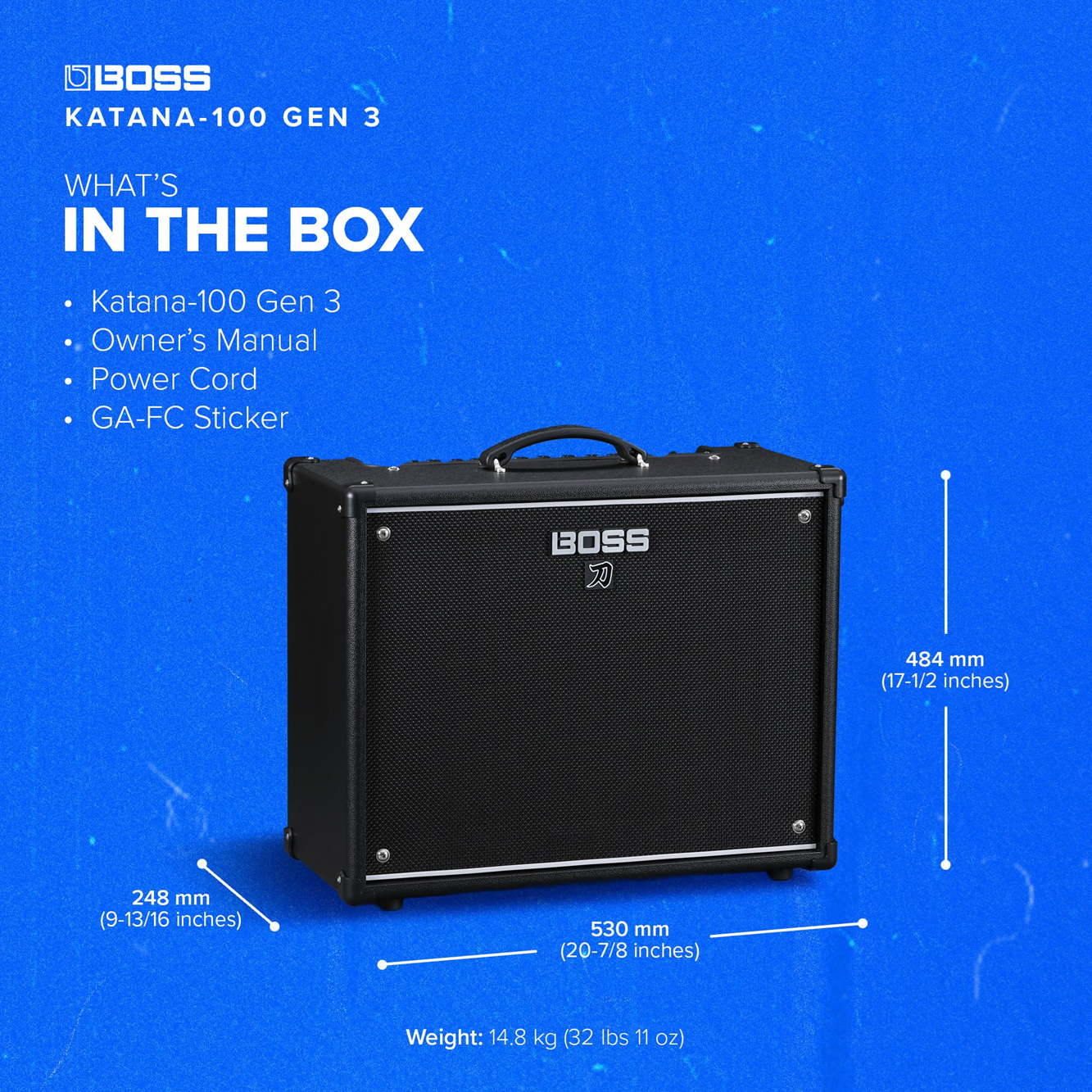 Dimensiones Combo de guitarra BOSS KATANA 100 GEN 3: 530 (ancho) x 248 (profundidad) x 484 (alto) mm