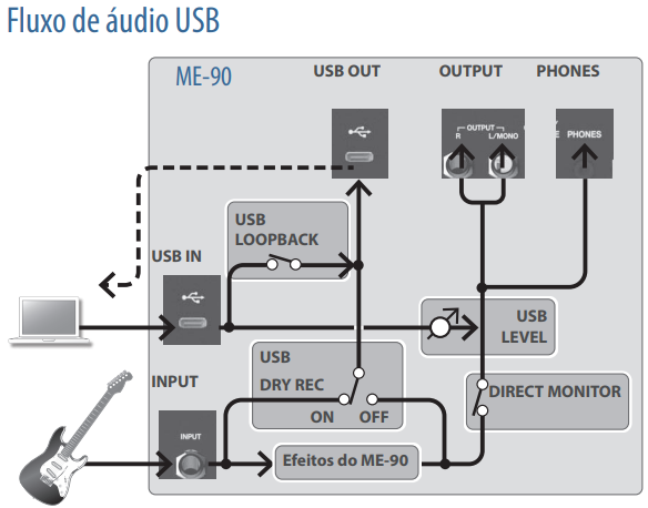 Bucle de efectos (Enviar/Retorno): Permite conectar pedales externos (como aumenta favoritos o un bucleador) a la cadena de señal ME-90.