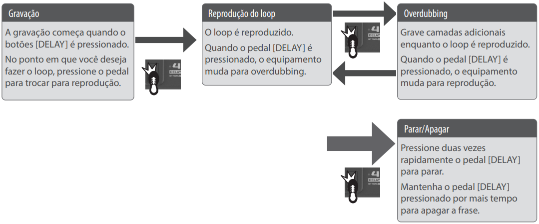 Modo manual: Transformar el conjunto de pedales en pedalera clásico, donde cada uno pedal Activa o desactiva el efecto correspondiente (por ejemplo, el pedal 1 activa el compresor, el pedal 2 activa el overdrive).