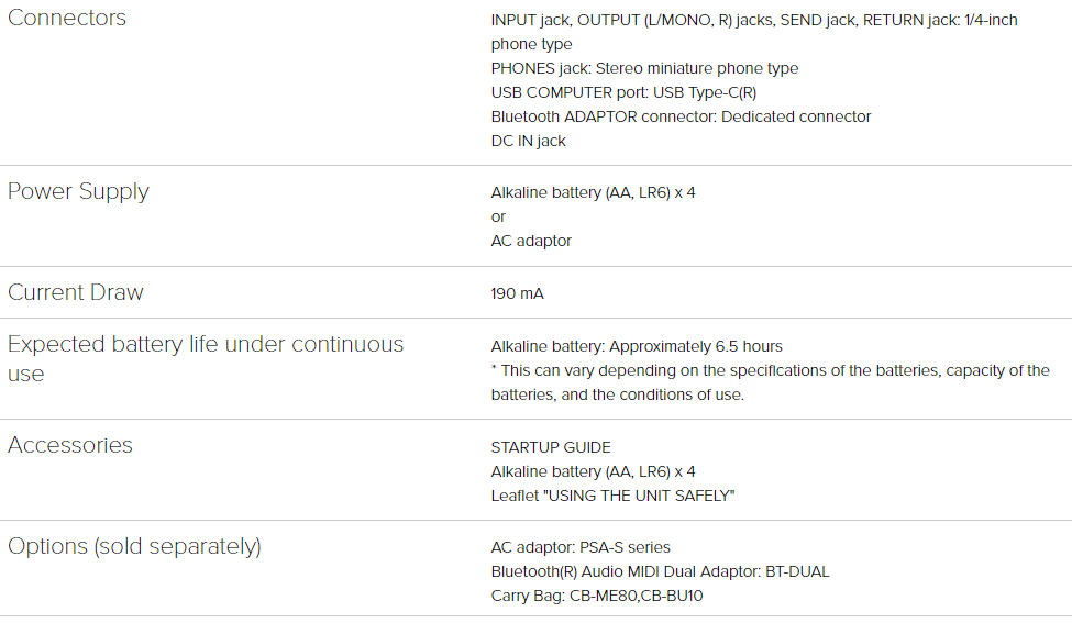| Alimentación flexible | Funciona con cuatro pilas AA o adaptador BOSS PSA-230S2 Opcional, ideal para músicos en movimiento. |