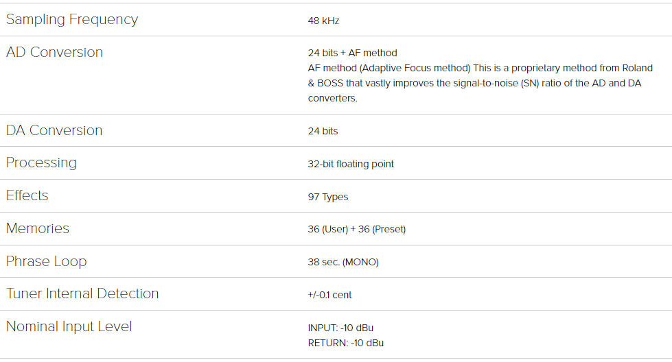| Efectos Premium | Incluye 60 efectos diferentes (y más de 20 adicionales vía BOSS Tone Studio) de alta calidad, cubriendo todas las categorías (OD/DS, Mod, Delay, Reverb, etc.). | |