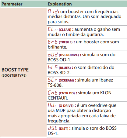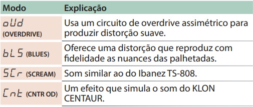 | BLUES (bLS) | Sobremarcha | Sonidos de blues con carácter, al estilo BOSS BD-2. |