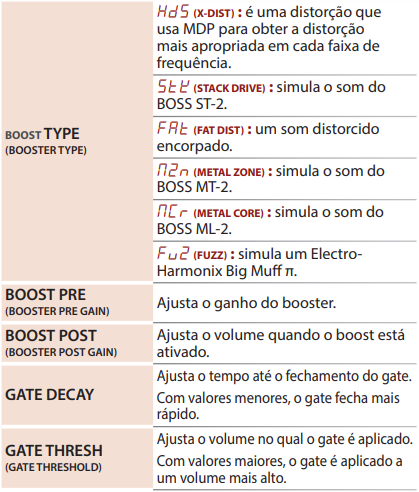 | Control de parámetros | Te permite activar/desactivar el efecto o el boost, o controlar parámetros como Drive, Level, Tone (Low, Mid, High), Booster Pre/Post Level, etc. | Control de Cambio (CC) | 2. CC personalizable: Los números CC (Control Change) se utilizan para controlar parámetros (como Drive, Level, On/Off, etc.). Son ajustables. (de CC# 1-31, 64-95) dentro del menú del pedal. |