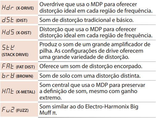 | X-METAL (MZn/MCr) | Alta ganancia (MDP) | Distorsión moderna y agresiva de alta ganancia, clara y definida (puede tener referencias como Metal Zone o Metal Core, pero la versión "X" utiliza MDP). |