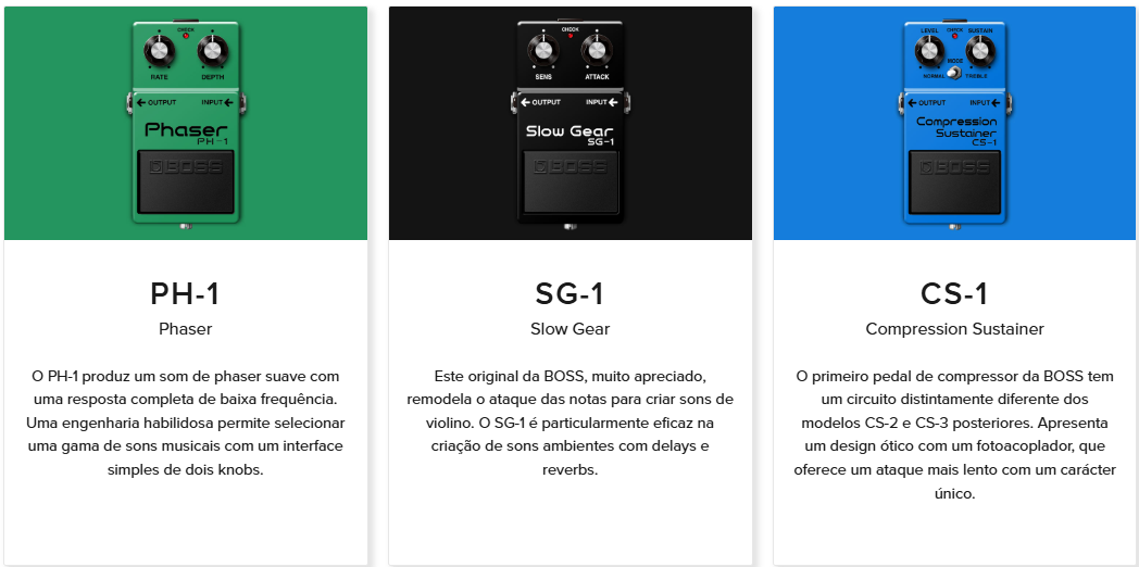 | Fáser PH-1 | Phaser | El primer pedal Phaser de BOSS, con un efecto de modulación clásico y suave. |