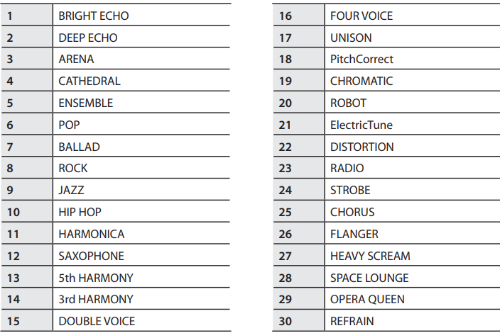 6 Tipos Efectos de alta calidad heredados de BOSS VE-20 (Reverberación, Retardo, Doble/Armonía, Dinámica, Corrección de tono, Tono/Efectos de sonido)