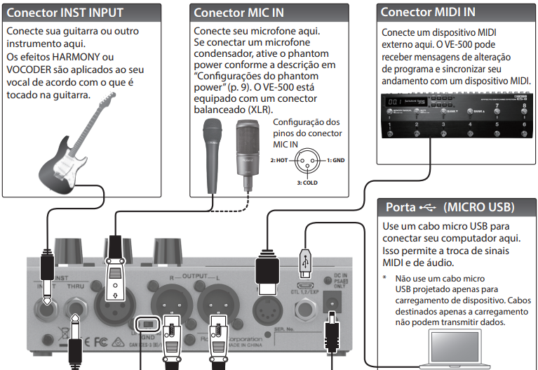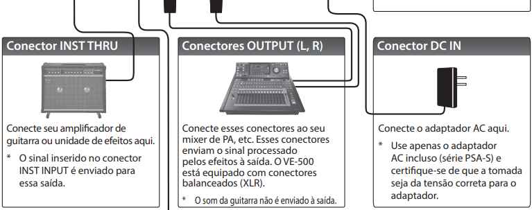 | Entrada de instrumento | INST (Conector de 1/4'') | Conecta tu guitarra (o teclado/otro instrumento) para accionar el motor. Armonía, corrección de tono y vocoder. | El símbolo de la guitarra se utiliza únicamente como referencia tonal. |