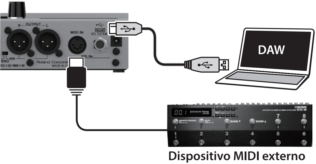 - 1 entrada "CTL1-2/EXP" para conectar el pedal de control externo opcional BOSS FS-6 y FS-7 o el pedal de expresión opcional Roland EV-5 y EV-30.