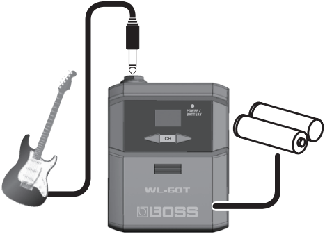 - El transmisor BOSS WL-60T funciona con varios instrumentos y tiene una duración de batería de hasta 25 horas con 2 baterías alcalinas AA.