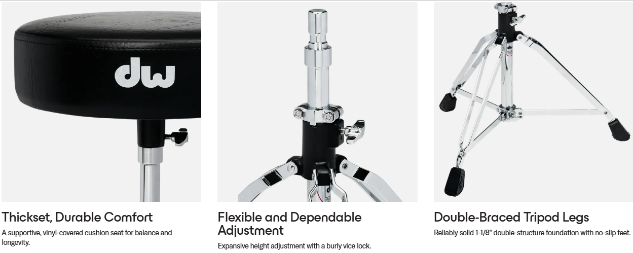 El trono DW Serie 3000 es ideal para cualquier baterista que busca un asiento sólido. Su base de trípode de acero resistente y sus patas de doble refuerzo están diseñadas para durar años. El trono Round Top cuenta con un asiento de espuma gruesa, duradero y recubierto de vinilo, que ofrece soporte y comodidad al sentarse frente a la batería. El trono Serie 3000 es una opción confiable de quienes reinventaron los herrajes para baterías. DW: La elección del baterista. Altura mínima: 53 cm [21"] Altura máxima: 72 cm [28.5"] *