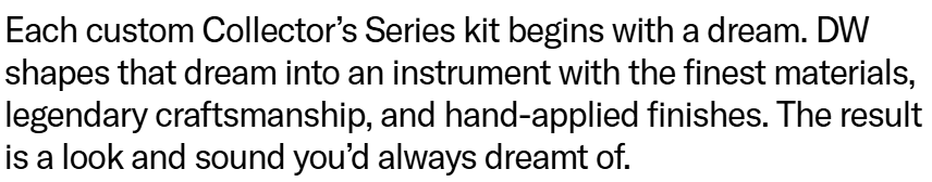 Serie de coleccionistas de DW es la linea de baterías de gama alta (de gama alta) Drum Workshop (DW). Representa lo último en artesanía personalizada, innovación en la construcción de cascos y calidad de sonido. Es lo que muchos bateristas profesionales y aficionados consideran el... tambores de ensueño.