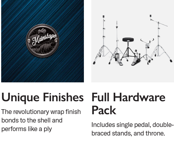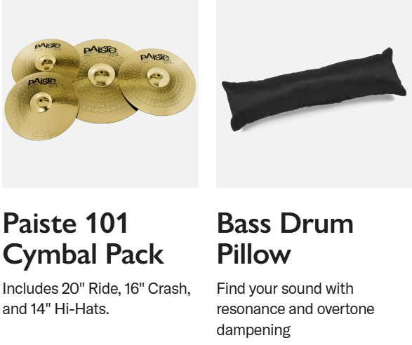 - El kit incluye: batería de 5 piezas + platillos Paiste 101 + pedal de bombo + trono de batería