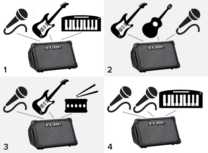 CUBE STREET EX funciona esencialmente como un pequeña mesa de mezclas a bateríapermitiendo que bandas enteras toquen con un solo amplificador (o dos conectados entre sí).