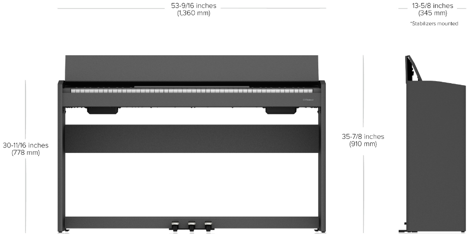 Dimensiones Piano digital Roland F107 BKX: 1360 (Ancho) x 345 (Profundidad) x 910 (Alto) mm
