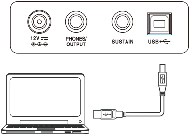 - 1 puerto USB tipo B para conexión a un ordenador (MIDI)
