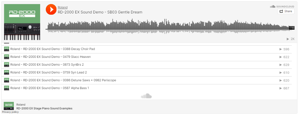 | Piano electrónico | Clásicos (como el RD-1000 original), Tine, Reed y otros sonidos eléctricos históricos (SuperNATURAL) | Más de 200 |