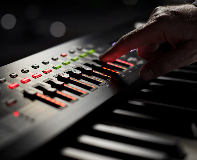 Controles en tiempo real: El panel ofrece nueve faders y ocho perillas con indicadores LED, todas asignables para el control inmediato de sonidos y efectos (como barras de órgano, efectos de modulación, etc.).