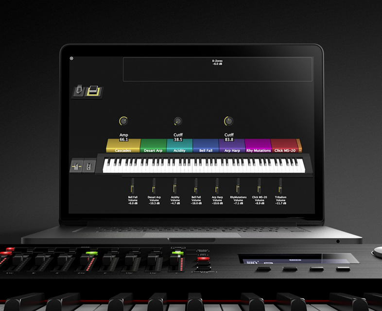 - 8 zonas totalmente programables para combinar sonidos internos y fuentes externas, incluyendo instrumentos de hardware y software.