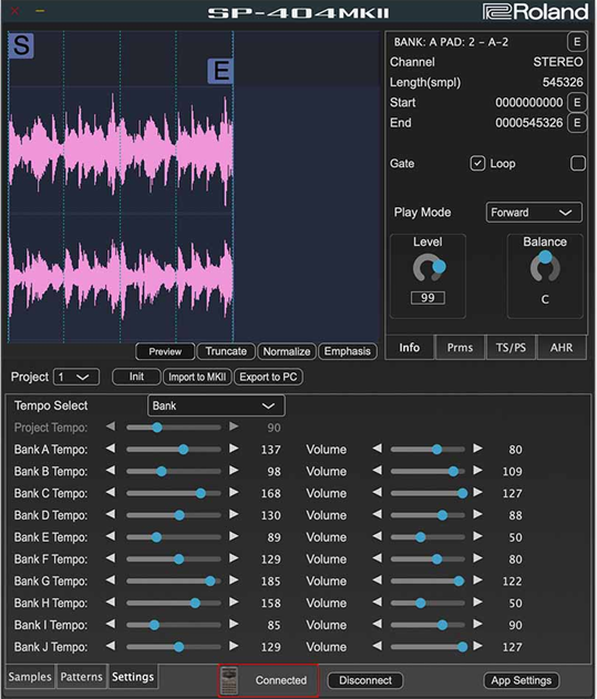 - El editor de software Roland SP-404MKII para Mac y Windows proporciona acceso directo a muestras, edición detallada de formas de onda, gestión de muestras, asignación de pads e importación de archivos MIDI y proyectos creados en Roland SP-404SX y Roland SP-404A.