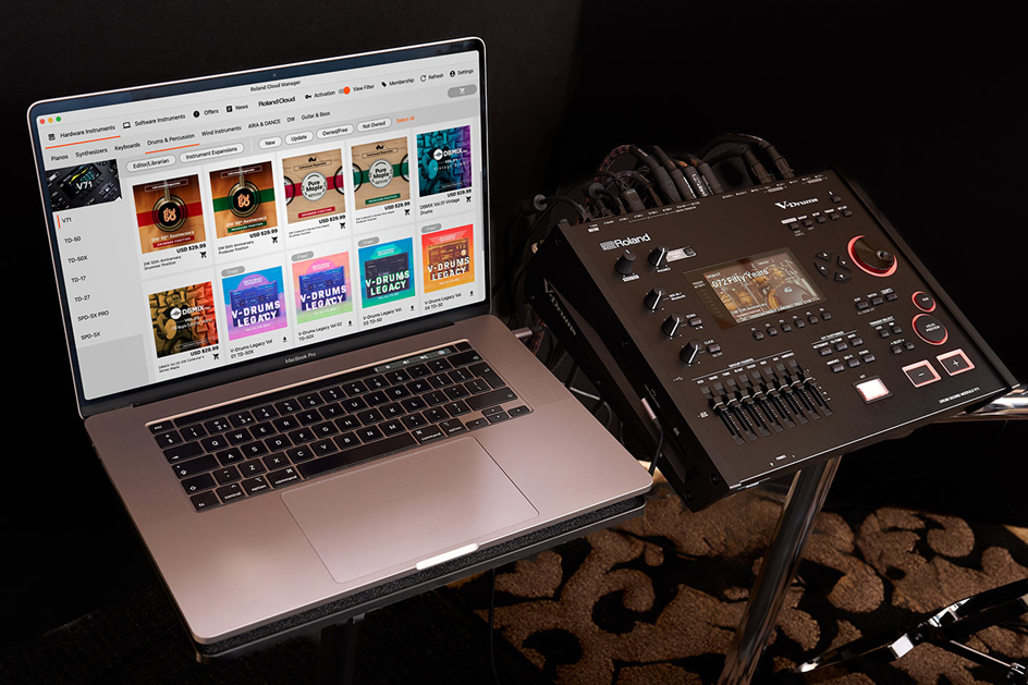 - Amplíe sus opciones creativas con una gama cada vez mayor de contenido de sonido en Roland Cloud, incluidas expansiones de instrumentos V-Drums de múltiples capas basadas en kits de batería DW premium.